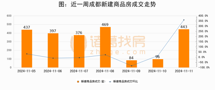 根据成都市住房和城乡建设局数据显示,2024年11月11日成都新建商品房成交443套,较昨日增加347套,环比上涨361.5%