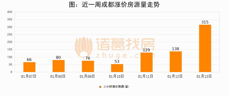 根据诸葛找房数据显示,成都24小时涨价房源量为315套,较01月12日增加177套,环比上涨128.3%。与此同时,涨价房源占比小幅扩大,业主信心有所提升。