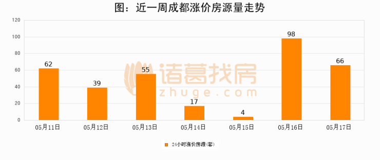 根据诸葛找房数据显示,成都24小时涨价房源量为66套,较05月16日减少32套,环比下降32.7%。与此同时,涨价房源占比小幅回落,对于购房者来说是一个入市窗口期,购房者可抓住时机入市。