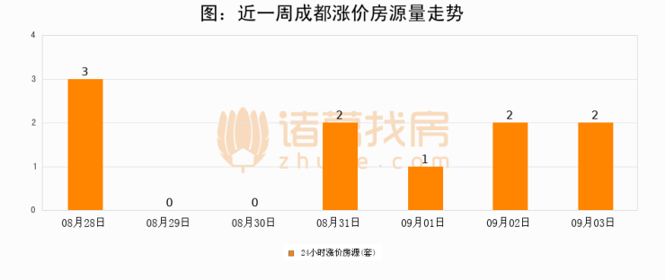 根据诸葛找房数据显示,成都24小时涨价房源量为2套,较09月02日持平。