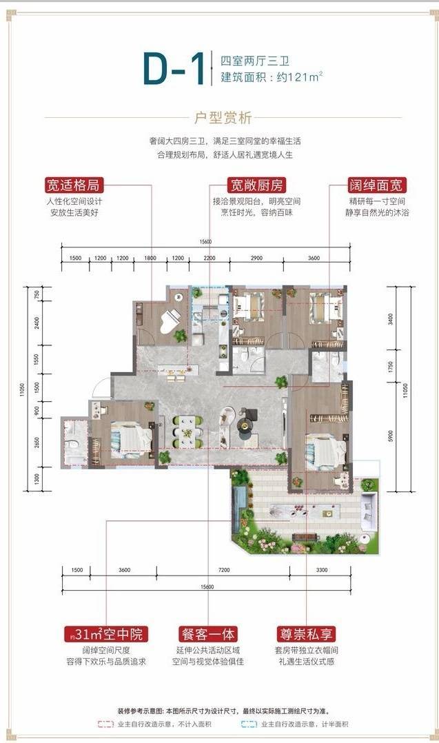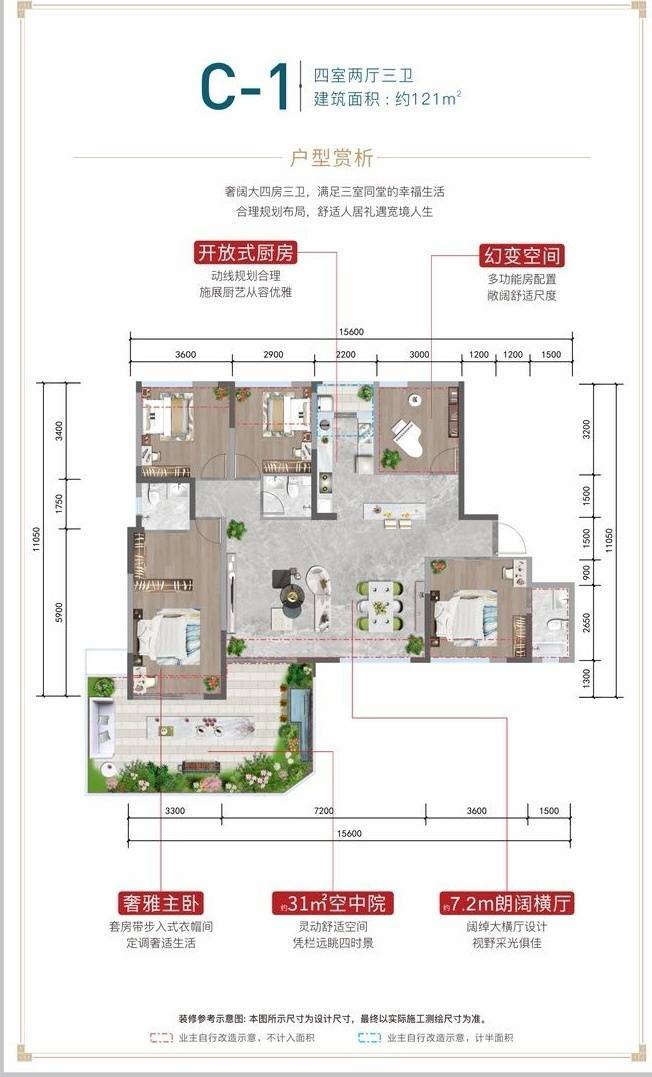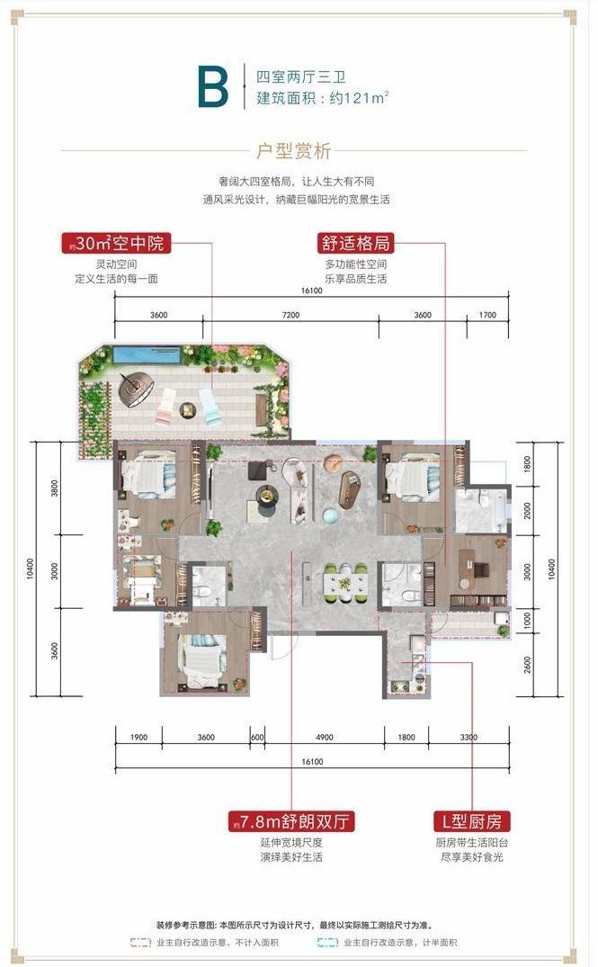 面积:120㎡实得180㎡(2梯2)121㎡最大实得188㎡(2梯3);主力户型121㎡