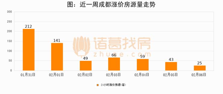 根据诸葛找房数据显示,成都24小时涨价房源量为25套,较02月05日减少18套,环比下降41.9%。与此同时,涨价房源占比小幅回落,对于购房者来说是一个入市窗口期,购房者可抓住时机入市。
