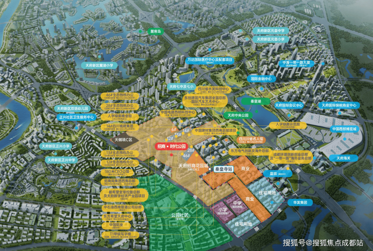 天府总部商务区以公园城市为设计理念,总体设计28.6平方公里,中央核心区范围8.5平方公里。区域突出总部经济聚能和高端服务赋能,构建以总部经济为核心引领,形成多元产业体系,打造面向世界的中央商务区、成都未来城市新中心。招商时代公园,位于天府总部商务区中心区域。