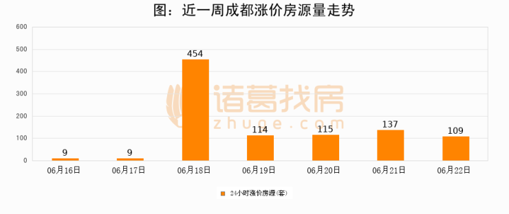 根据诸葛找房数据显示,成都24小时涨价房源量为109套,较06月21日减少28套,环比下降20.4%。与此同时,涨价房源占比小幅回落,对于购房者来说是一个入市窗口期,购房者可抓住时机入市。