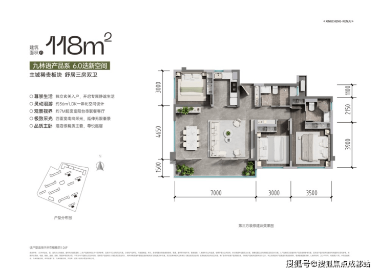 有 7M 超面宽阳台,近 36㎡双面采光横厅,酒店级精质主套,空间舒适,采光充足。
