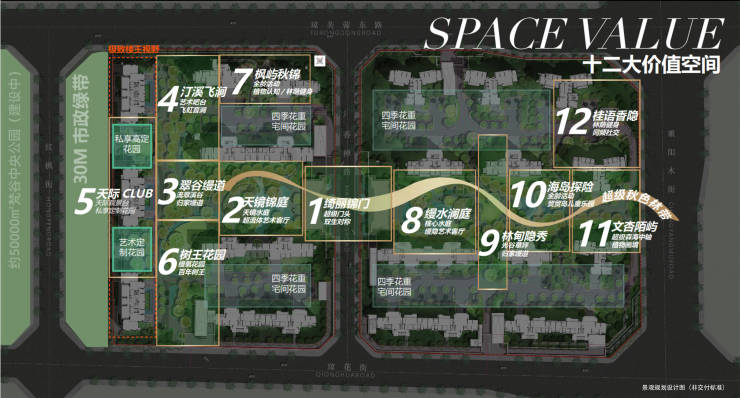 【梵谷公园中央生活区 高端居住价值集成】以梵谷中央公园为核心,规划文教、生态绿廊、运动休闲、商业服务、高端住区等多元化生活空间。