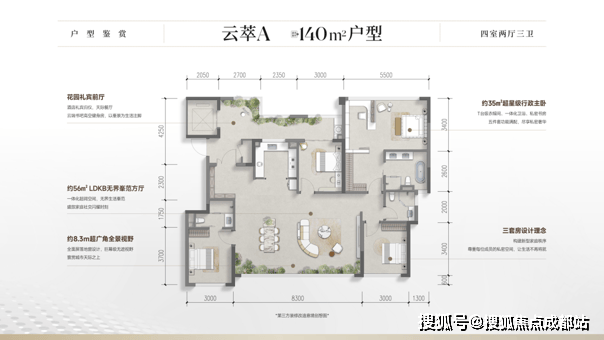主力户型建面约 126㎡、140㎡四房三卫双套房,精准匹配二孩家庭、三代同堂。