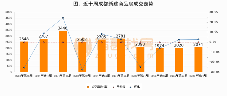进入2025年第04周(01月20日-01月26日),成都新建商品房成交2074套,较上周增加54套,环比上涨2.7%