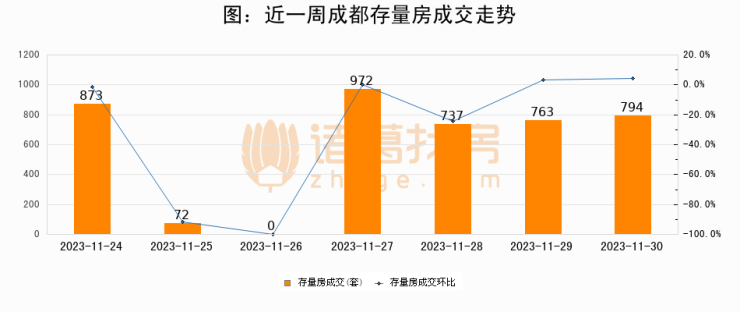 从存量房来看,2023年11月30日成都存量房单日成交794套,比昨日增加31套,环比上涨4.1%。从近一周存量房成交来看,成都存量房日均成交套数为601套,11月30日单日成交794套,高于近一周平均水平32.1%。