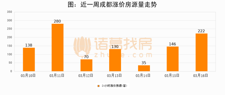 根据诸葛找房数据显示,成都24小时涨价房源量为222套,较03月15日增加76套,环比上涨52.1%。与此同时,涨价房源占比小幅扩大,业主信心有所提升。