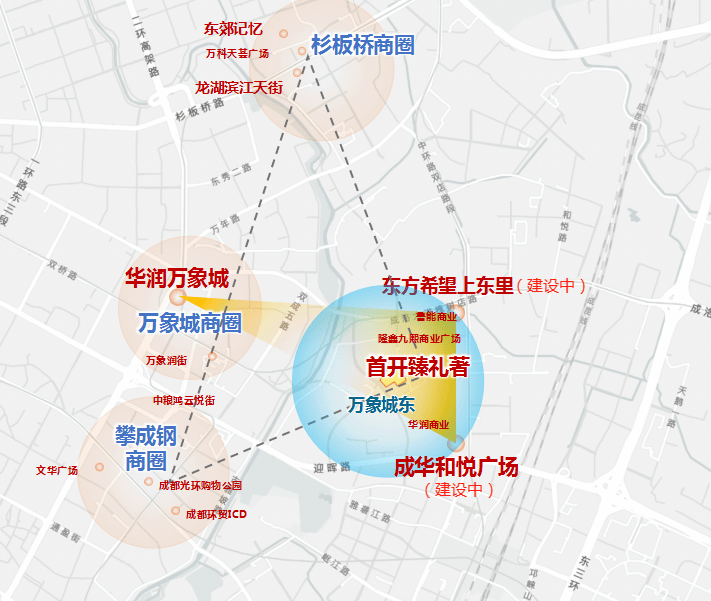 万象城东与万象城商圈、攀成钢商圈、杉板桥商圈三大高端商圈共同构成东二环的“黄金三角”区,已形成媲美金融城商圈的潮流文化引领地,也将是城东高端生活居住区的首选地。