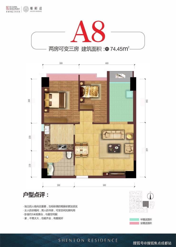 4、A8——74.45㎡:两房可变三房