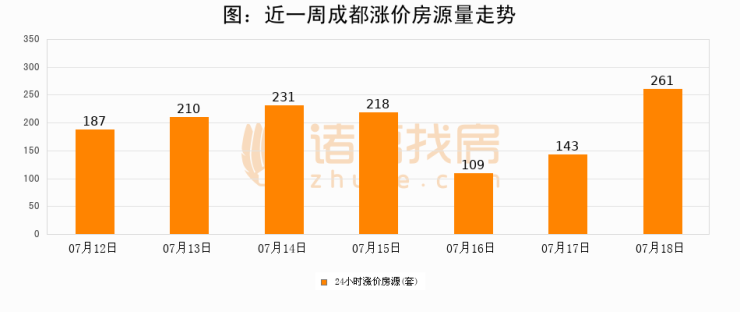 根据诸葛找房数据显示,成都24小时涨价房源量为261套,较07月17日增加118套,环比上涨82.5%。与此同时,涨价房源占比小幅扩大,业主信心有所提升。