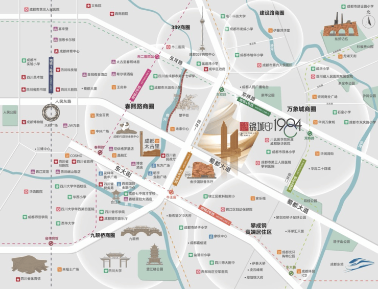 六大商圈:项目周边六大商圈集聚,步行即达全国顶级商圈「春熙路/太古里」,更有「万象城」、「339」、「九眼桥」、「建设路」、「东大街/攀成钢」等六大商圈包围,亿万人流在此汇集!此外,项目周边盒马生鲜、永辉超市等生活类商业配套一应俱全,生活便利舒心!