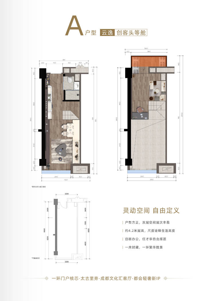 公寓产品:建面约35-42平,主力面积38平,层高4.2米,6T29户。标准loft公寓,单层面积1100平,可自由组合,随心搭配!