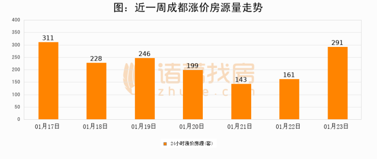 根据诸葛找房数据显示,成都24小时涨价房源量为291套,较01月22日增加130套,环比上涨80.7%。与此同时,涨价房源占比小幅扩大,业主信心有所提升。