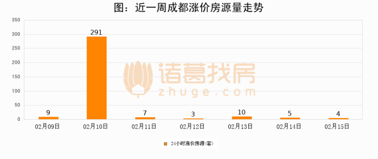 根据诸葛找房数据显示,成都24小时涨价房源量为4套,较02月14日减少1套,环比下降20%。与此同时,涨价房源占比小幅回落,对于购房者来说是一个入市窗口期,购房者可抓住时机入市。