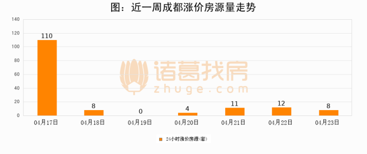 根据诸葛找房数据显示,成都24小时涨价房源量为8套,较04月22日减少4套,环比下降33.3%。与此同时,涨价房源占比小幅回落,对于购房者来说是一个入市窗口期,购房者可抓住时机入市。