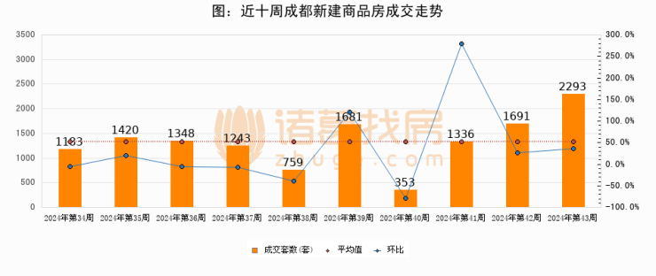 进入2024年第43周(10月21日-10月27日),成都新建商品房成交2293套,较上周增加602套,环比上涨35.6%