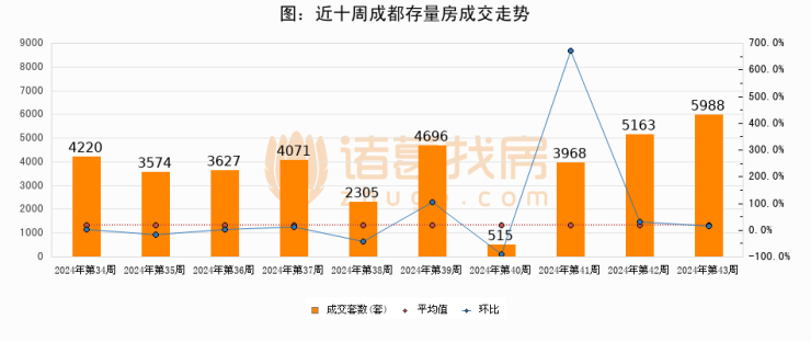存量房方面,第43周成都存量房成交5988套,较上周增加825套,环比上涨16%。从近十周成交走势来看,周均成交套数为3812套,本周高于平均水平57.1%。