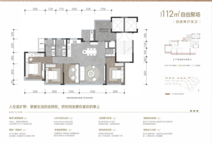 锦樾序的户型设计彰显创新理念。建筑面积约112平方米户型突破传统格局,实现标准四房配置。16.2米南向面宽确保客厅及四间卧室均享充足采光。创新设计的玄关储藏空间与独立生活阳台,在有限面积内完美兼顾收纳功能与生活便利。