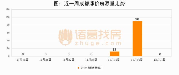 根据诸葛找房数据显示,成都24小时涨价房源量为0套,较11月30日减少90套,环比下降100%。与此同时,涨价房源占比小幅回落,对于购房者来说是一个入市窗口期,购房者可抓住时机入市。