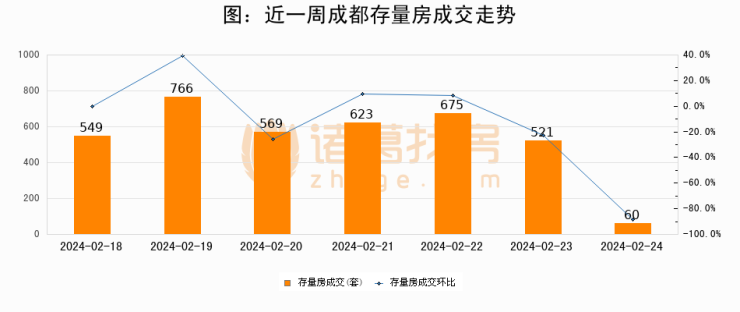从存量房来看,2024年02月24日成都存量房单日成交60套,比昨日减少461套,环比下降88.5%。从近一周存量房成交来看,成都存量房日均成交套数为537套,02月24日单日成交60套,低于近一周平均水平88.8%。