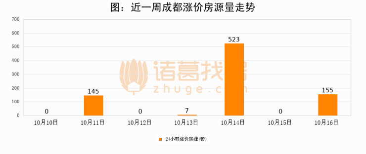 根据诸葛找房数据显示,成都24小时涨价房源量为155套,较10月15日增加155套,环比上涨0%。与此同时,涨价房源占比小幅扩大,业主信心有所提升。