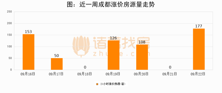 根据诸葛找房数据显示,成都24小时涨价房源量为177套,较09月21日增加177套,环比上涨0%。与此同时,涨价房源占比小幅扩大,业主信心有所提升。