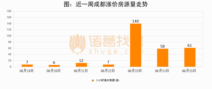 根据诸葛找房数据显示,成都24小时涨价房源量为61套,较06月24日增加3套,环比上涨5.2%。与此同时,涨价房源占比小幅扩大,业主信心有所提升。