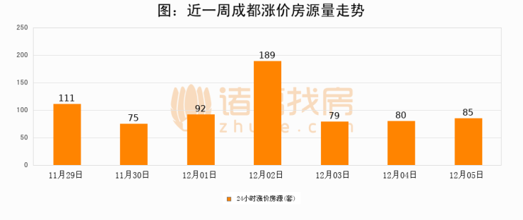 根据诸葛找房数据显示,成都24小时涨价房源量为85套,较12月04日增加5套,环比上涨6.2%。与此同时,涨价房源占比小幅扩大,业主信心有所提升。