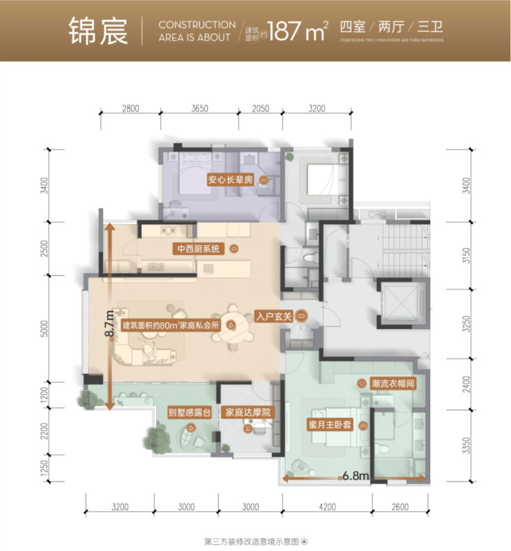 约40㎡主卧套房配备广角观景窗与双台盆系统,通过精心布局倡导恋人般亲密关系,为夫妻营造持续保鲜的居住体验。