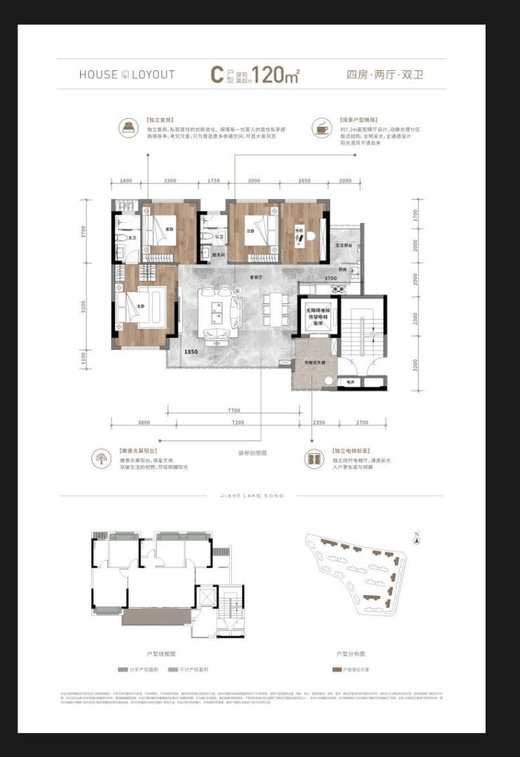 四房两厅两卫/建面约120㎡(赠送下来约150平;实得132平)
