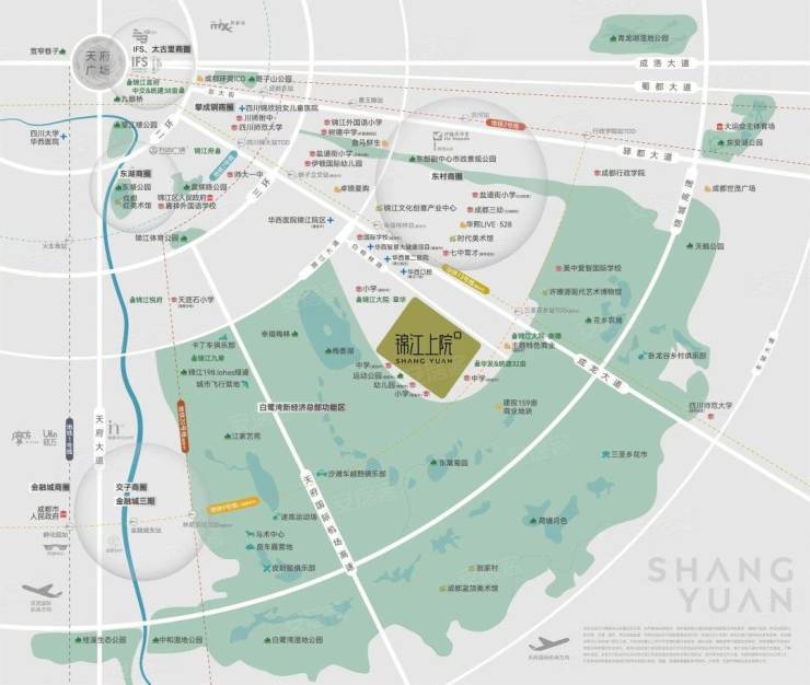 项目位于三圣乡板块,外拥20000亩城市绿肺与锦江万干繁华,顶层规划布局,立足城市天际,距金融城约6.5公里,距春熙路约8.5公里,与金融城,太古里-东大街构成黄金三角区 ; 承接锦江向南,金融城向东发展的双向奔赴,高能产业聚集、繁华城市基底、低密留白规划、不可复刻生态,高净值人群聚落。