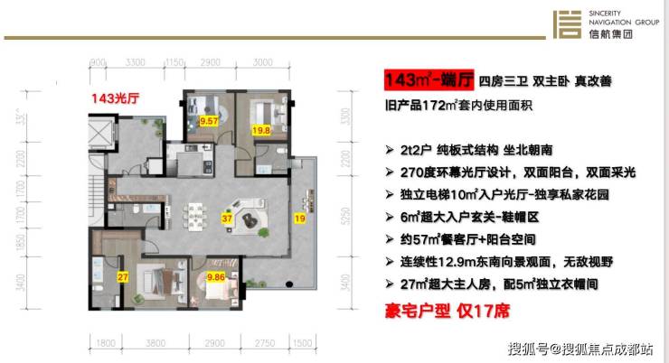 143m²套四三卫 端光厅设计,双主卧户型得房率107%,套内实得面积约153m²,媲美市场其他产品170-180m²套内实得面积,联通阳台后餐客厅空间可达79m²(此户型,城北仅此本项目独有)