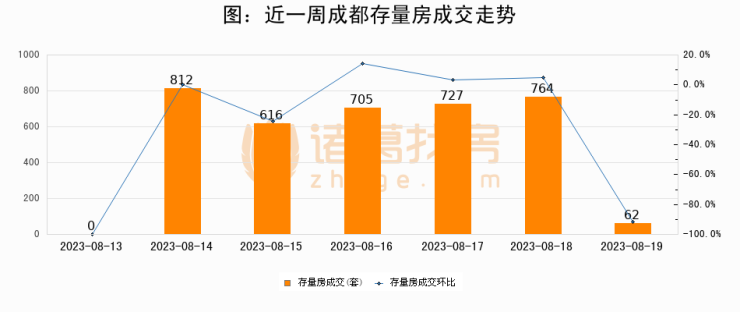 从存量房来看,2023年08月19日成都存量房单日成交62套,比昨日减少702套,环比下降91.9%。从近一周存量房成交来看,成都存量房日均成交套数为526套,08月19日单日成交62套,低于近一周平均水平88.2%。