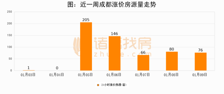 根据诸葛找房数据显示,成都24小时涨价房源量为76套,较01月08日减少4套,环比下降5%。与此同时,涨价房源占比小幅回落,对于购房者来说是一个入市窗口期,购房者可抓住时机入市。
