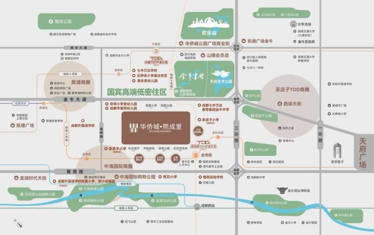 商业配套:五大商圈环绕(龙湖西宸天街/中海国际/欢乐谷/一品天下/犀浦)