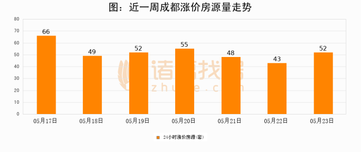 根据诸葛找房数据显示,成都24小时涨价房源量为52套,较05月22日增加9套,环比上涨20.9%。与此同时,涨价房源占比小幅扩大,业主信心有所提升。