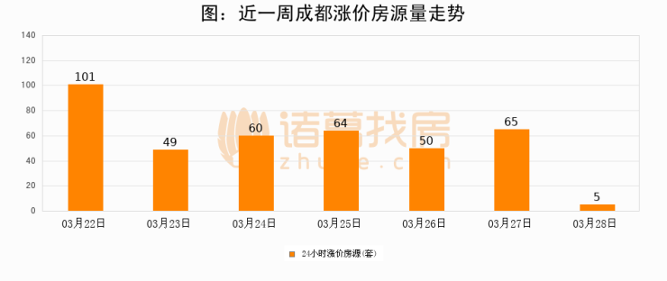根据诸葛找房数据显示,成都24小时涨价房源量为5套,较03月27日减少60套,环比下降92.3%。与此同时,涨价房源占比小幅回落,对于购房者来说是一个入市窗口期,购房者可抓住时机入市。