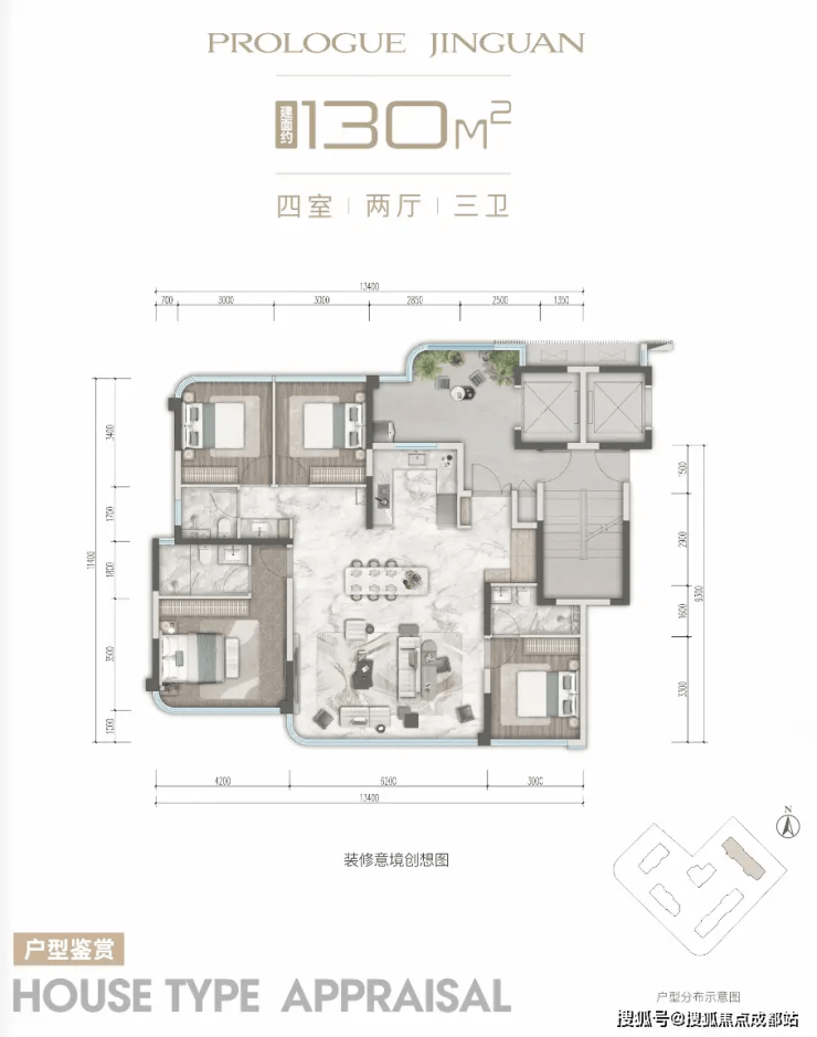 项目产品定位纯粹改善,户型涵盖建面约130-143㎡,以及部分建面约173-240㎡的大平层产品。其中,建面约130㎡的套四三卫户型作为起步产品,设计上亮点颇多,基本能够满足目前大部分家庭的居住需求。