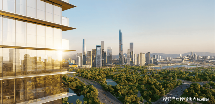采用玻璃、铝板与石材、陶板的全幕墙体系,结合视觉黄金比例设计,以极简的线条和优雅的配色营造城市公共艺术感,打造出高端公建化的立面效果,与周边489米超塔地标及天府公园形成视觉呼应。