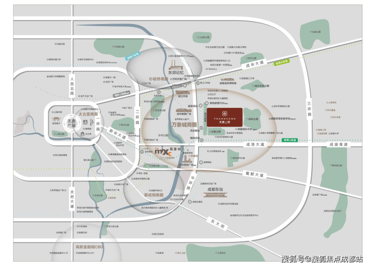 天宸上院3公里范围内(直线距离),被万象城、杉板桥、攀成钢三大高能级商圈环绕,创造无可复制的超级城市底盘,为生活赋予丰富配套。