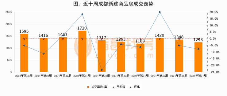 进入2024年第37周(09月09日-09月15日),成都新建商品房成交1243套,较上周减少105套,环比下降7.8%