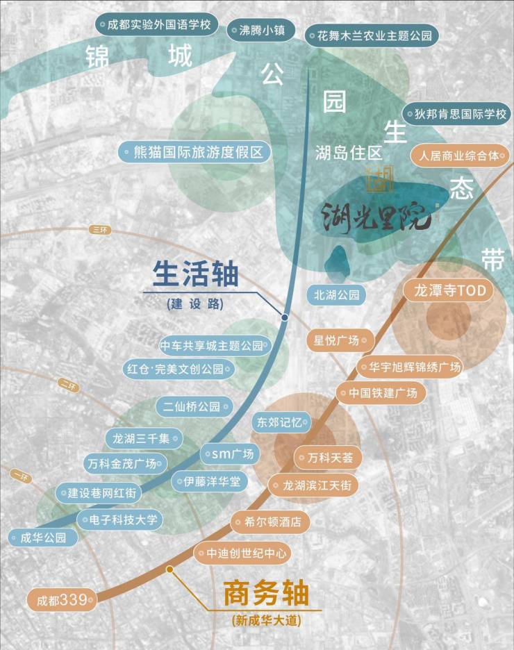两轴:新成华大道构筑的商务轴;建设路-蜀龙路串联的生活轴