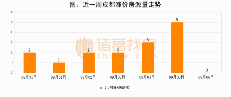 根据诸葛找房数据显示,成都24小时涨价房源量为0套,较09月05日减少5套,环比下降100%。与此同时,涨价房源占比小幅回落,对于购房者来说是一个入市窗口期,购房者可抓住时机入市。