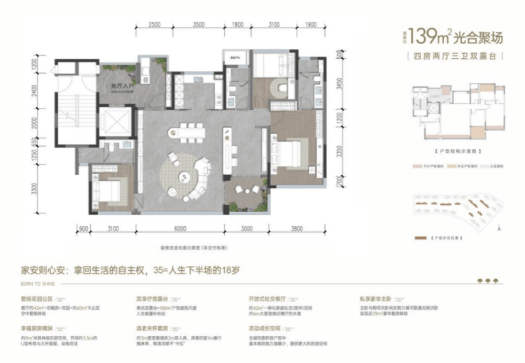 建筑面积约139平方米户型以约400万级定位,呈现三卫设计的平等居住理念。特别规划的约8平方米情景阳台,创造出具延展性的生活空间,实现室内外生活的自然过渡。