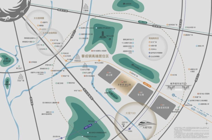【生态配套】双公园环伺,中央公园住区距项目1公里——400余亩塔子山公园+125亩东站绿轴公园盛景,市区最大的综合公园,东二环区域心脏位置。距项目3公里——3000亩成都最大青龙湖湿地公园,贴近自然的主城理想生活。