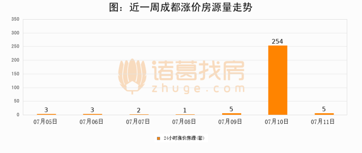 根据诸葛找房数据显示,成都24小时涨价房源量为5套,较07月10日减少249套,环比下降98%。与此同时,涨价房源占比小幅回落,对于购房者来说是一个入市窗口期,购房者可抓住时机入市。