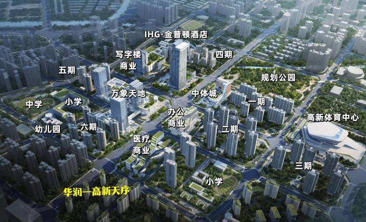 半径约500m范围可享万象天地(在建)、洲际金普顿酒店(已签约)、中体城(在建)、高新体育中心、E-park公园(待建)、省人民医院高新分院(待建)